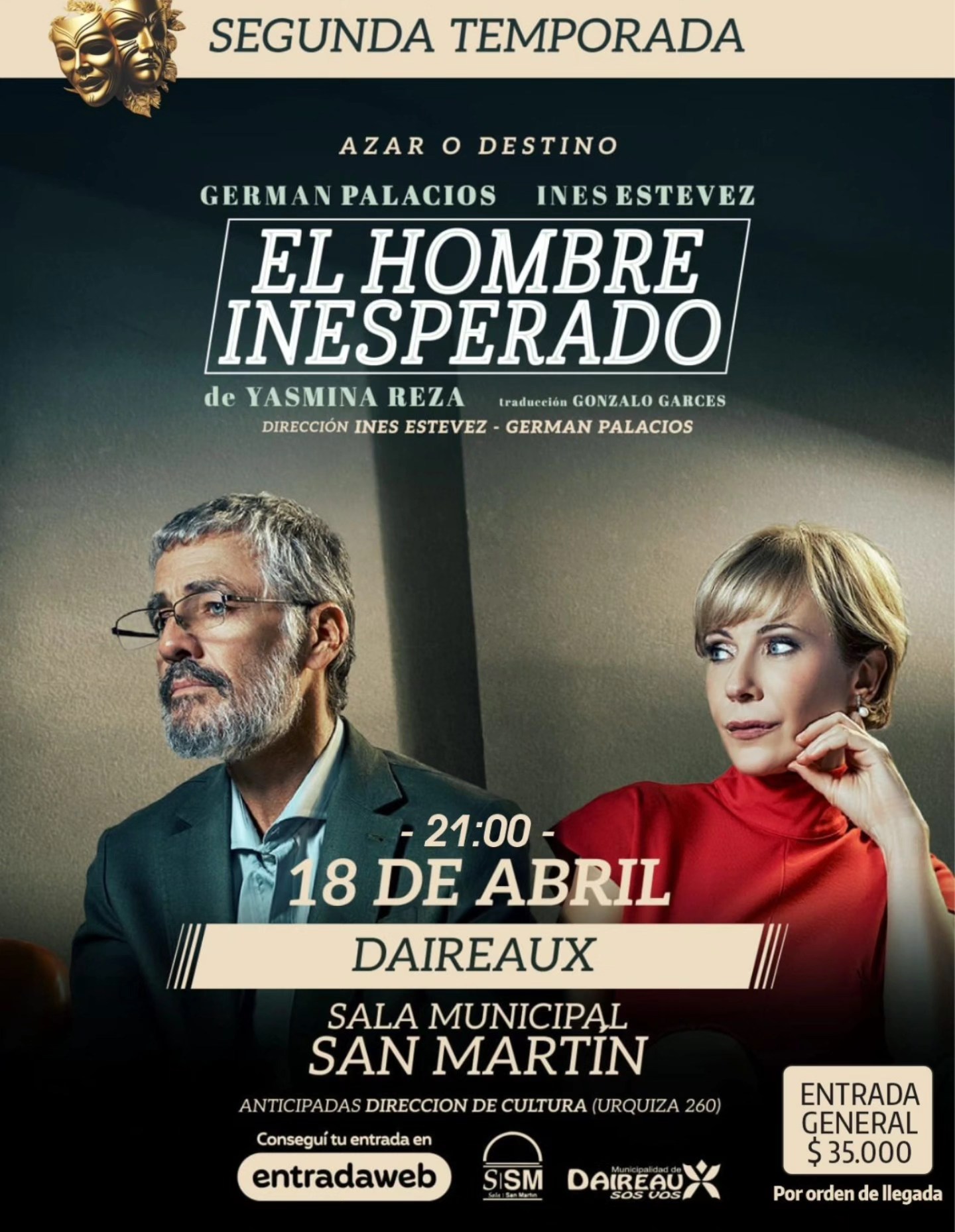 Por otra parte, el sábado 18 de abril a las 21:00 llegará a Daireaux la obra teatral El hombre inesperado, protagonizada por Germán Palacios e Inés Estévez, con dirección de ambos artistas. La reconocida pieza teatral de Yasmina Reza se presentará también en la Sala Municipal San Martín. Las entradas anticipadas pueden adquirirse en la Dirección de Cultura (Urquiza 260) o a través de la plataforma EntradaWeb. La entrada general tiene un valor de $35.000.