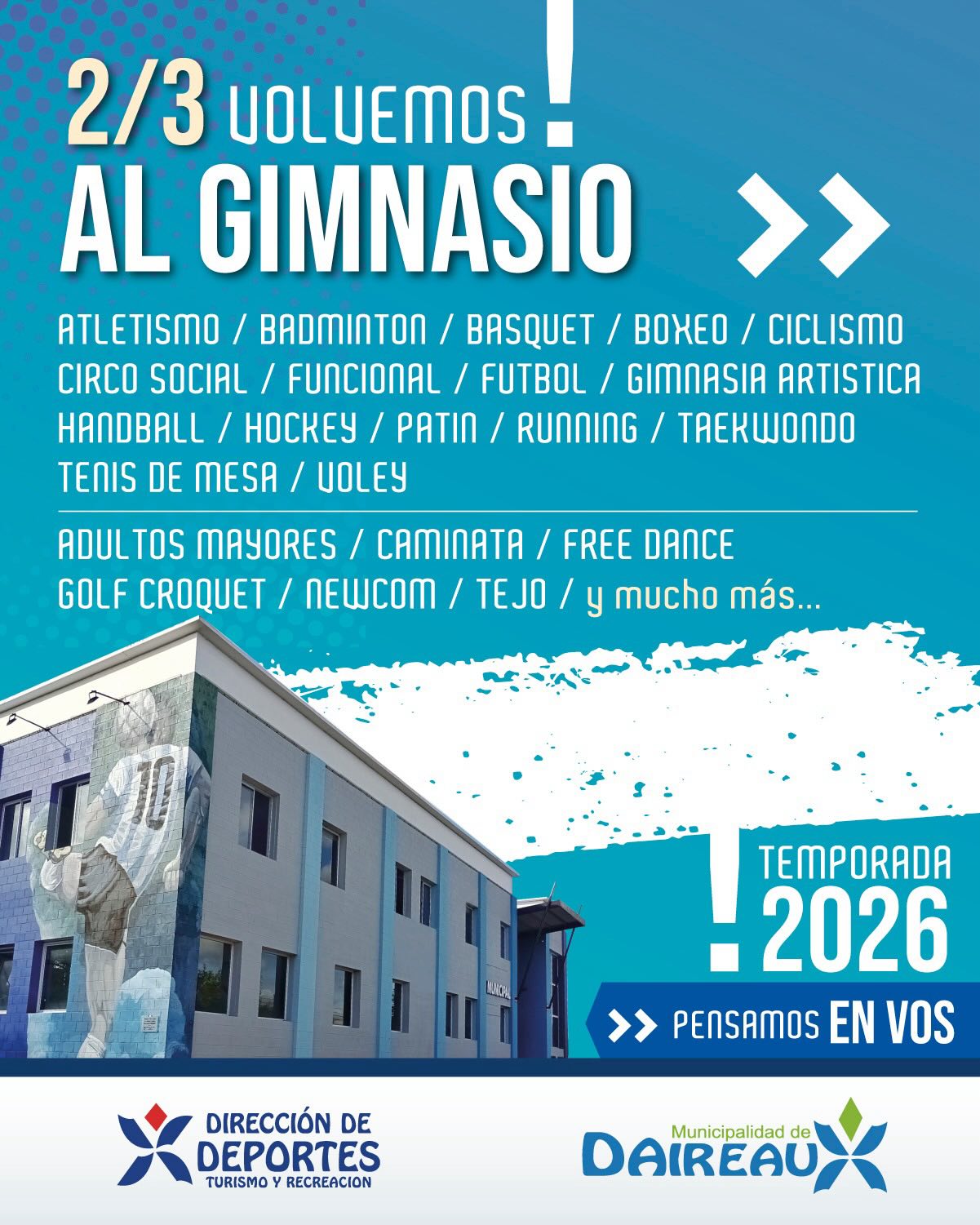 Desde este lunes 2 de marzo regresan las actividades deportivas en el Gimnasio Municipal, dando comienzo a la temporada 2026 con una amplia propuesta destinada a niñas, niños, jóvenes, personas adultas y adultos mayores.