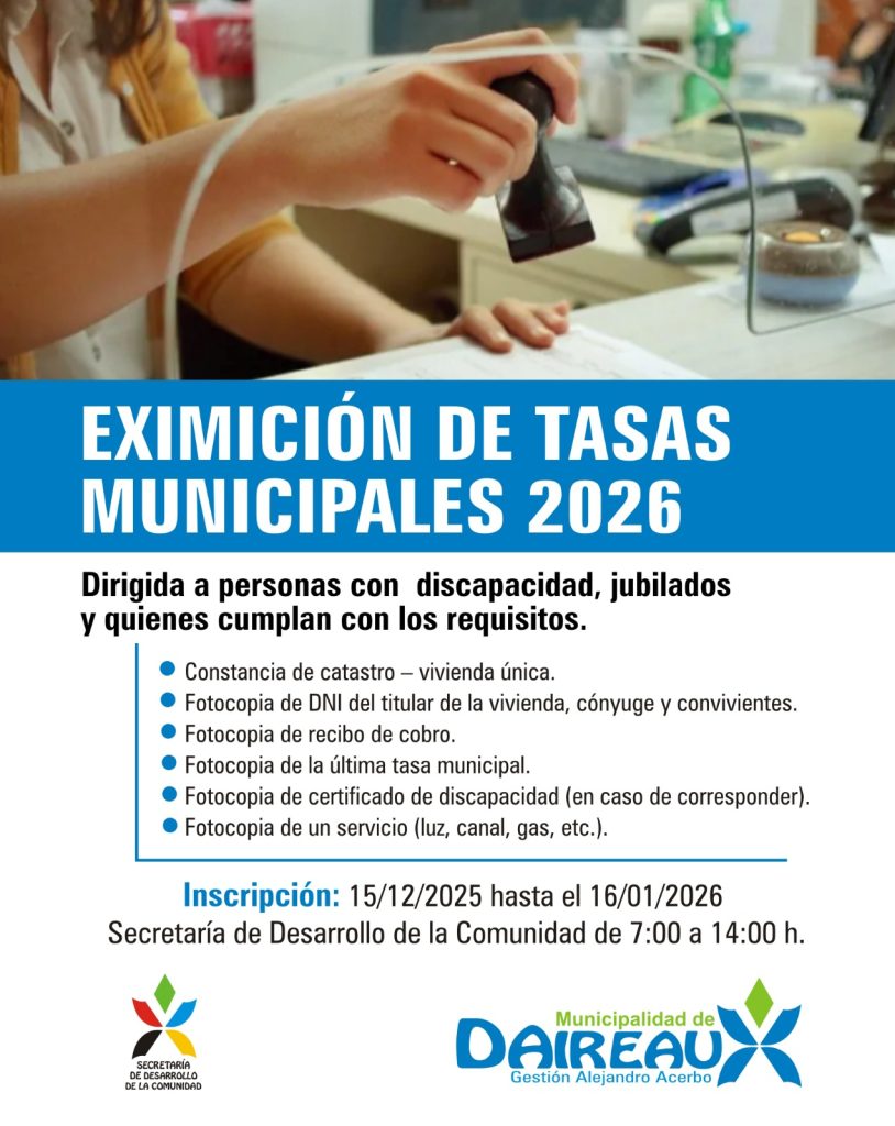 La Municipalidad de Daireaux informa que, a partir del 15 de diciembre, se abrirá la inscripción para la Eximición de Tasas Municipales 2026, destinada a personas con discapacidad, jubilados y quienes cumplan con los requisitos establecidos.