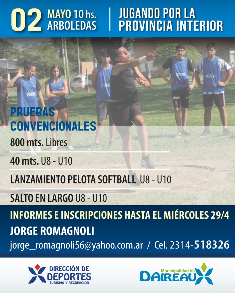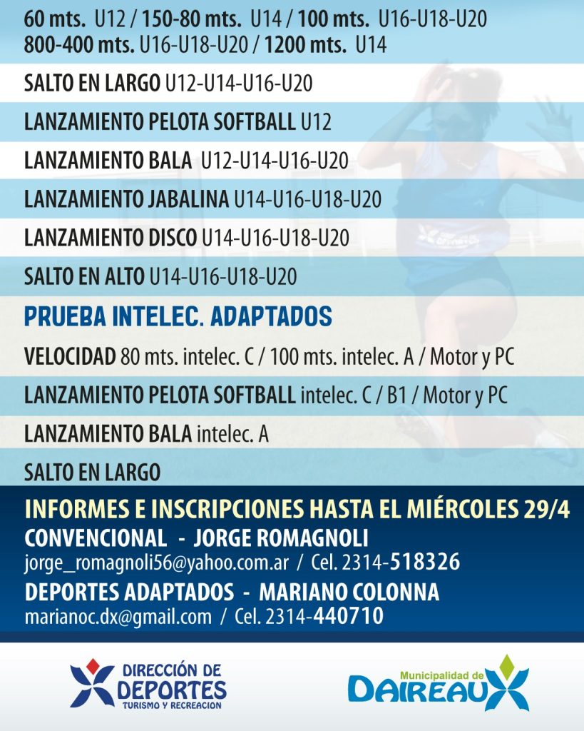 Las inscripciones estarán abiertas hasta el miércoles 29 de abril: pruebas convencionales al 2314 51-8326 (prof. Jorge Romagnoli) y deportes adaptados al 2314 44-0710 (prof. Mariano Colonna).