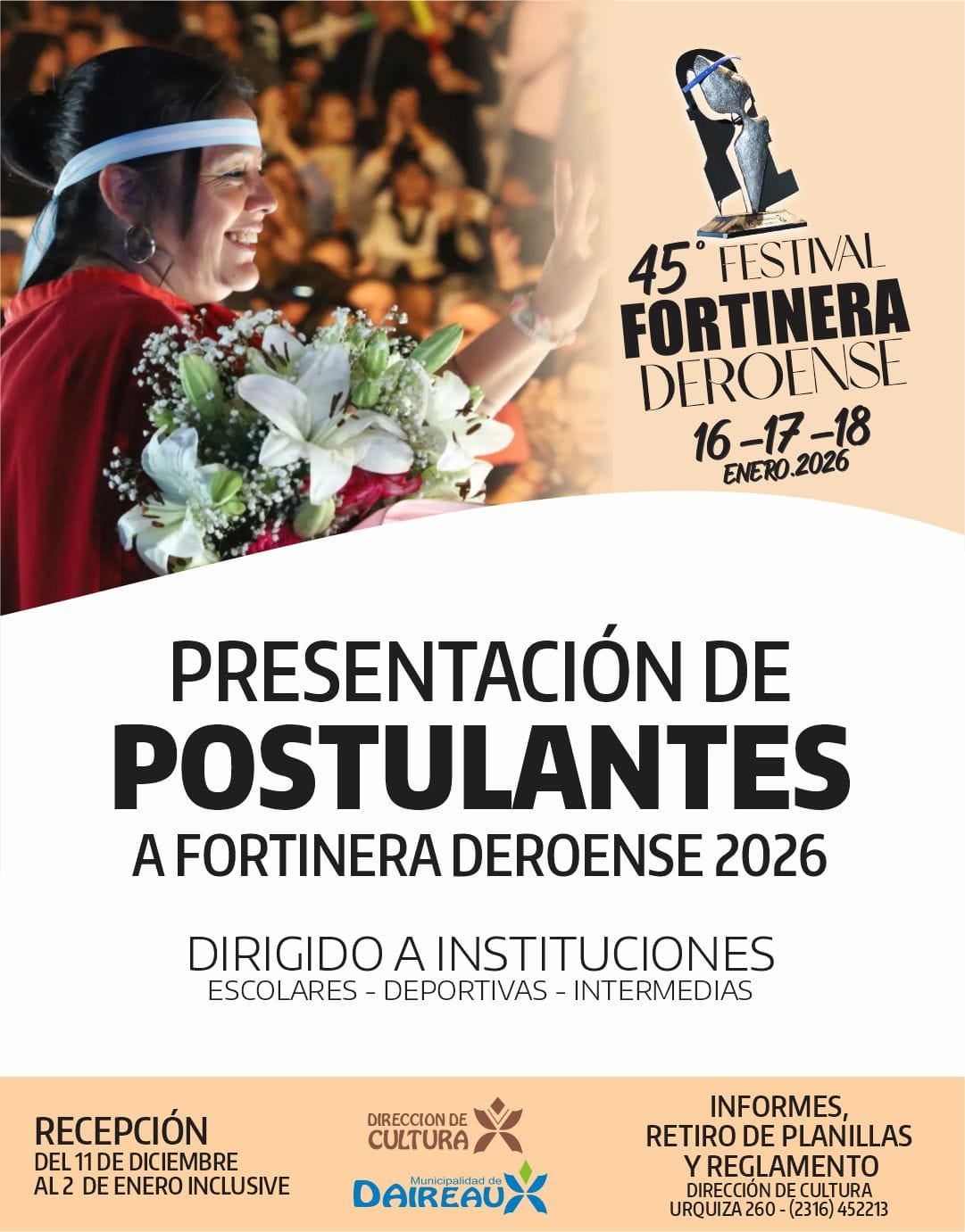 La Dirección de Cultura informa que a partir del 11 de diciembre y hasta el 2 de enero inclusive, comienza el período para la presentación de postulantes a Fortinera Deroense 2026. La convocatoria está destinada a instituciones escolares, deportivas e intermedias.
