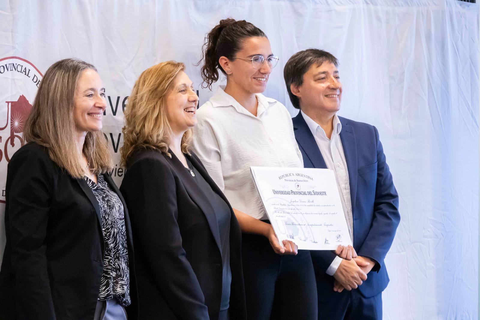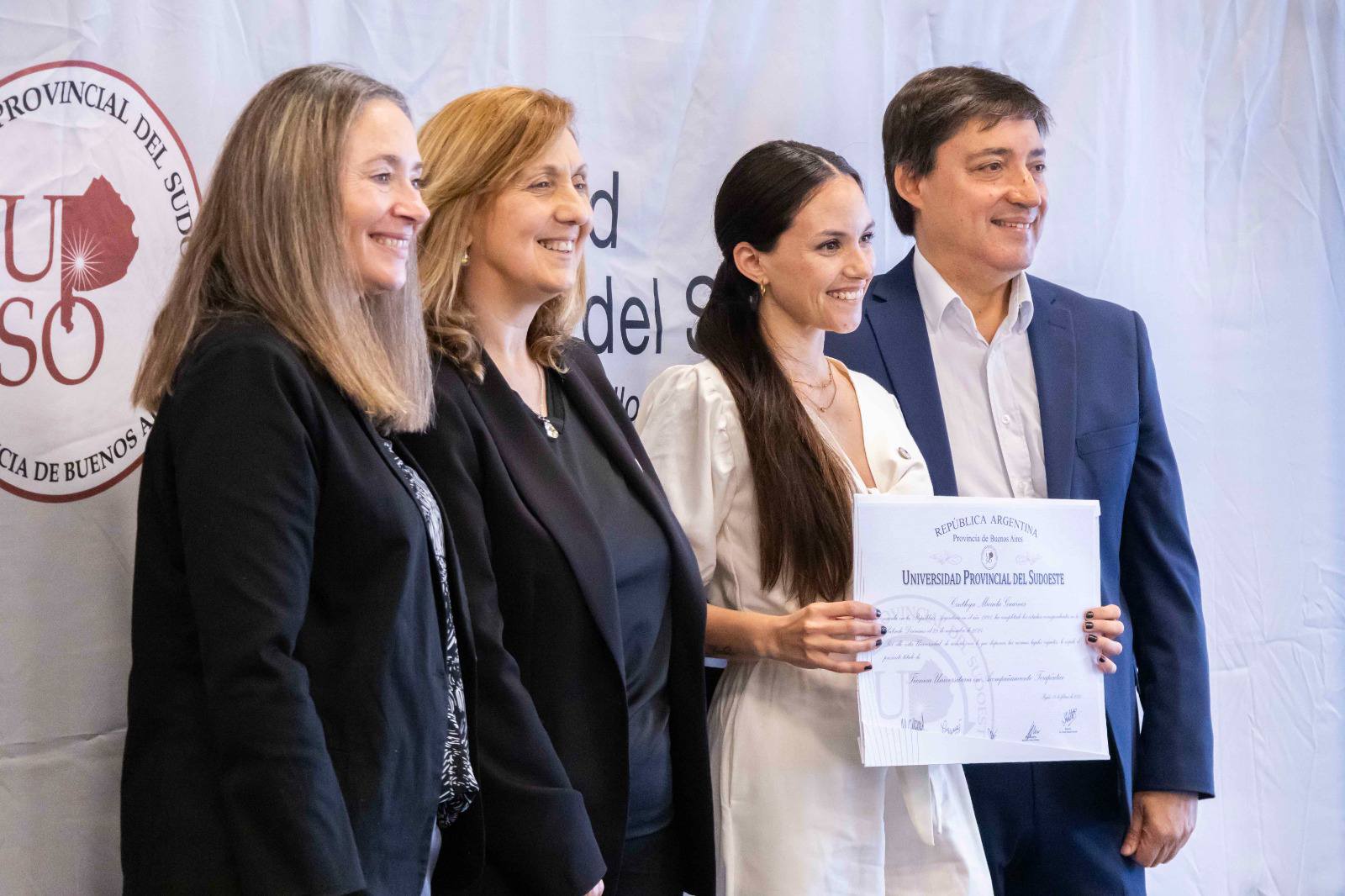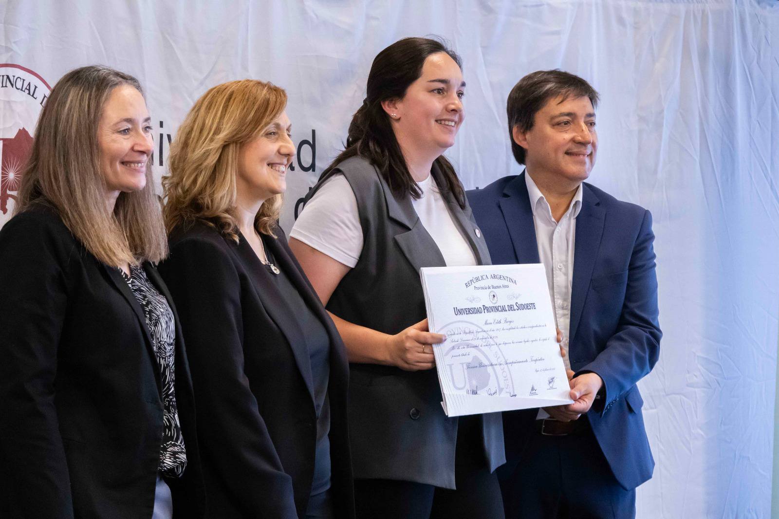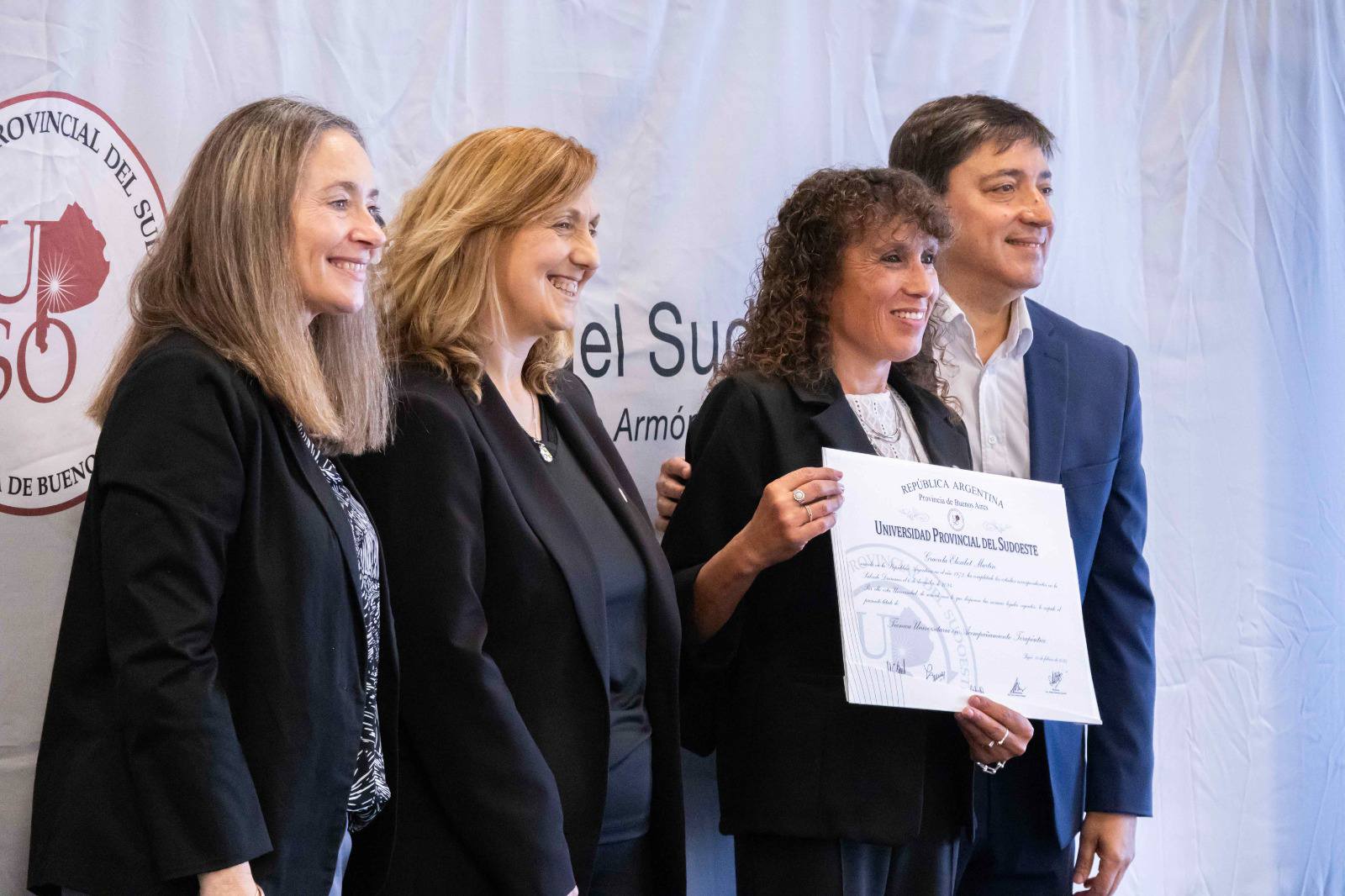 La Rectora Savoretti felicitó a las egresadas y subrayó la importancia de contar con centros universitarios locales equipados y de calidad. Además, celebró la incorporación de la nueva Tecnicatura Universitaria en Producción Agropecuaria Sostenible, orientada a fortalecer la producción local con una mirada ambiental y de sostenibilidad.