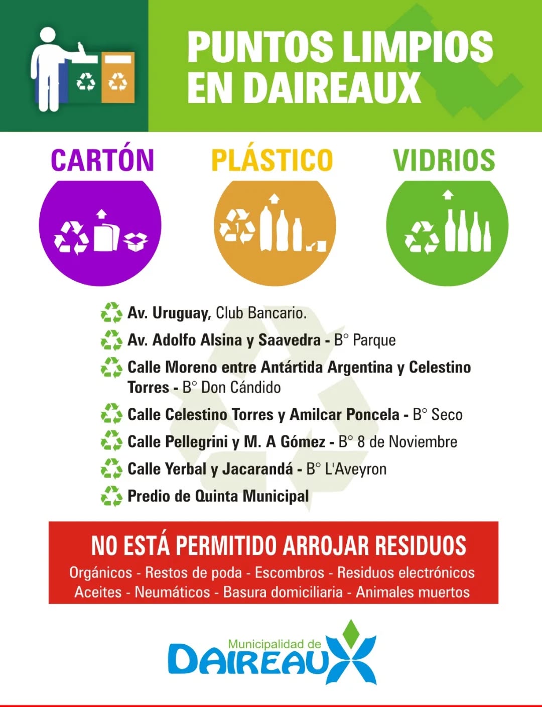 La Municipalidad de Daireaux recuerda a los vecinos y vecinas la ubicación de los Puntos Limpios. Espacios pensados para reducir la cantidad de residuos que terminan en el relleno sanitario y de esta manera, contribuir al cuidado del entorno natural.
